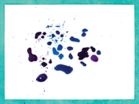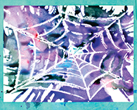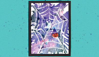 6. Blow the paint across the paper with a straw. Turn your paper and blow from different directions to cover the page and expose the crayon-resist spider web. Continue to add watercolor until you’ve achieved your desired result and most of the spider web is revealed. Allow watercolor to dry.