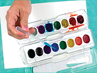 4. Use a pipette to add water to watercolors of your choice, and use a paintbrush to mix the water and paint in the palette.